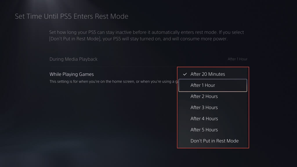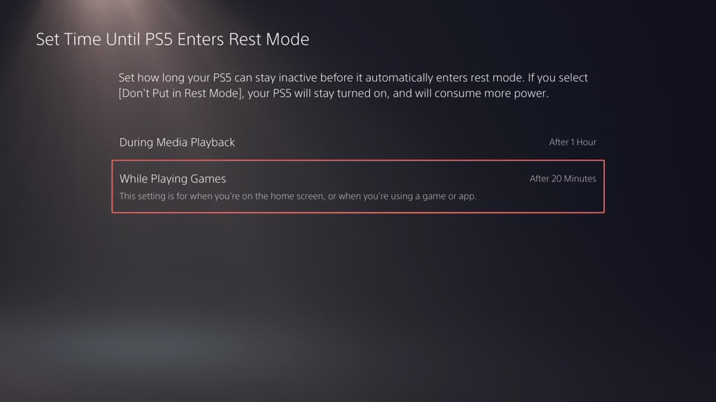 - Wählen Sie Ihre bevorzugte Dauer aus, bevor Sie in den Ruhemodus wechseln, während Sie auf dem Startbildschirm oder einem Videospiel oder einer App im Leerlauf sind – die kürzeste (und standardmäßige) ZeitNach 20 Minuten, und Sie können das auf erhöhenNach 1 Stunde,Nach 2 Stunden,Nach 3 Stunden, und so weiter.