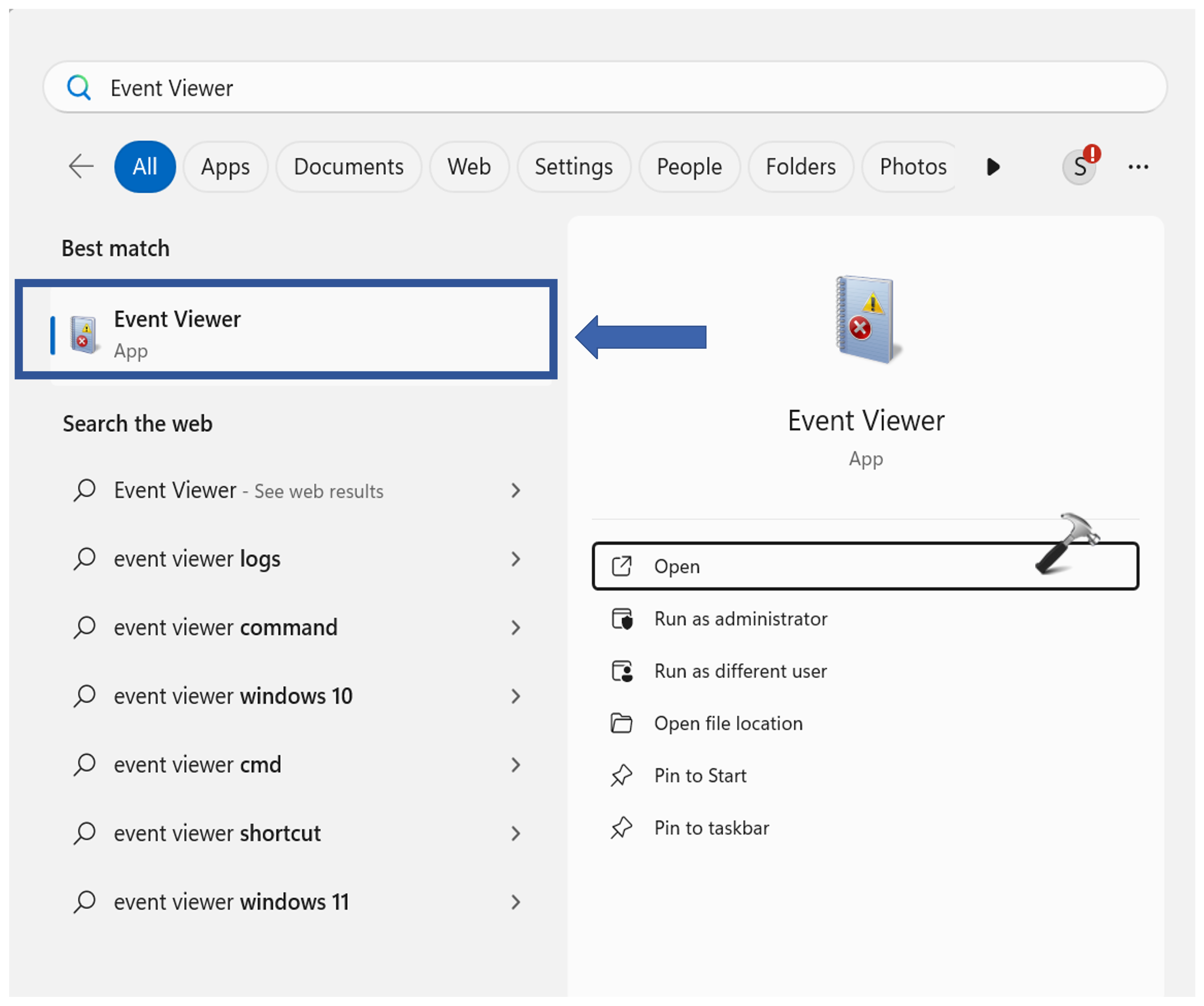 4. Öffnen Sie das Suchmenü und geben Sie „Ereignisanzeige„. Öffnen Sie die App.