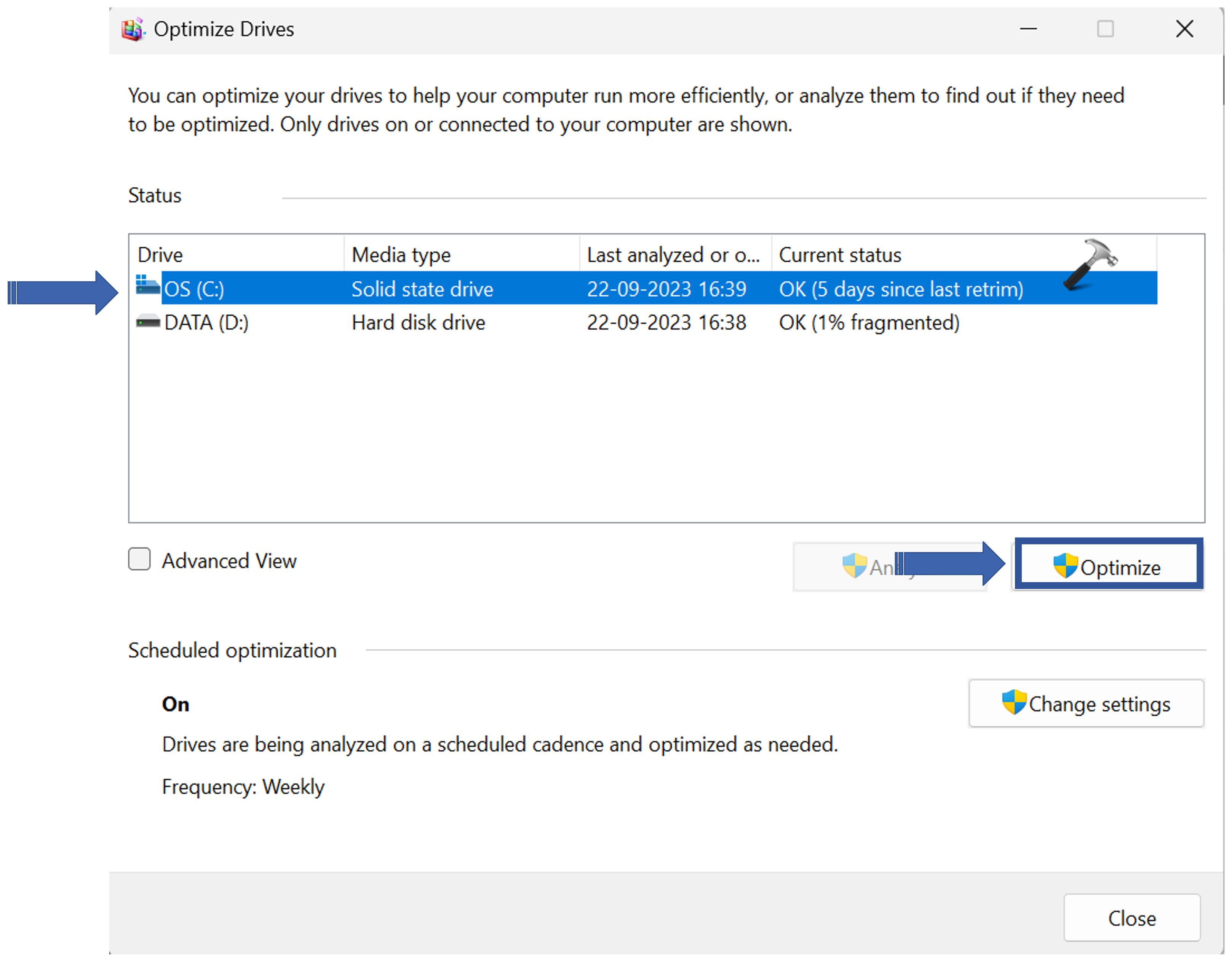 2. Wählen Sie nun „(C:)” Laufwerk und klicken Sie dann auf das „Optimieren”-Option.