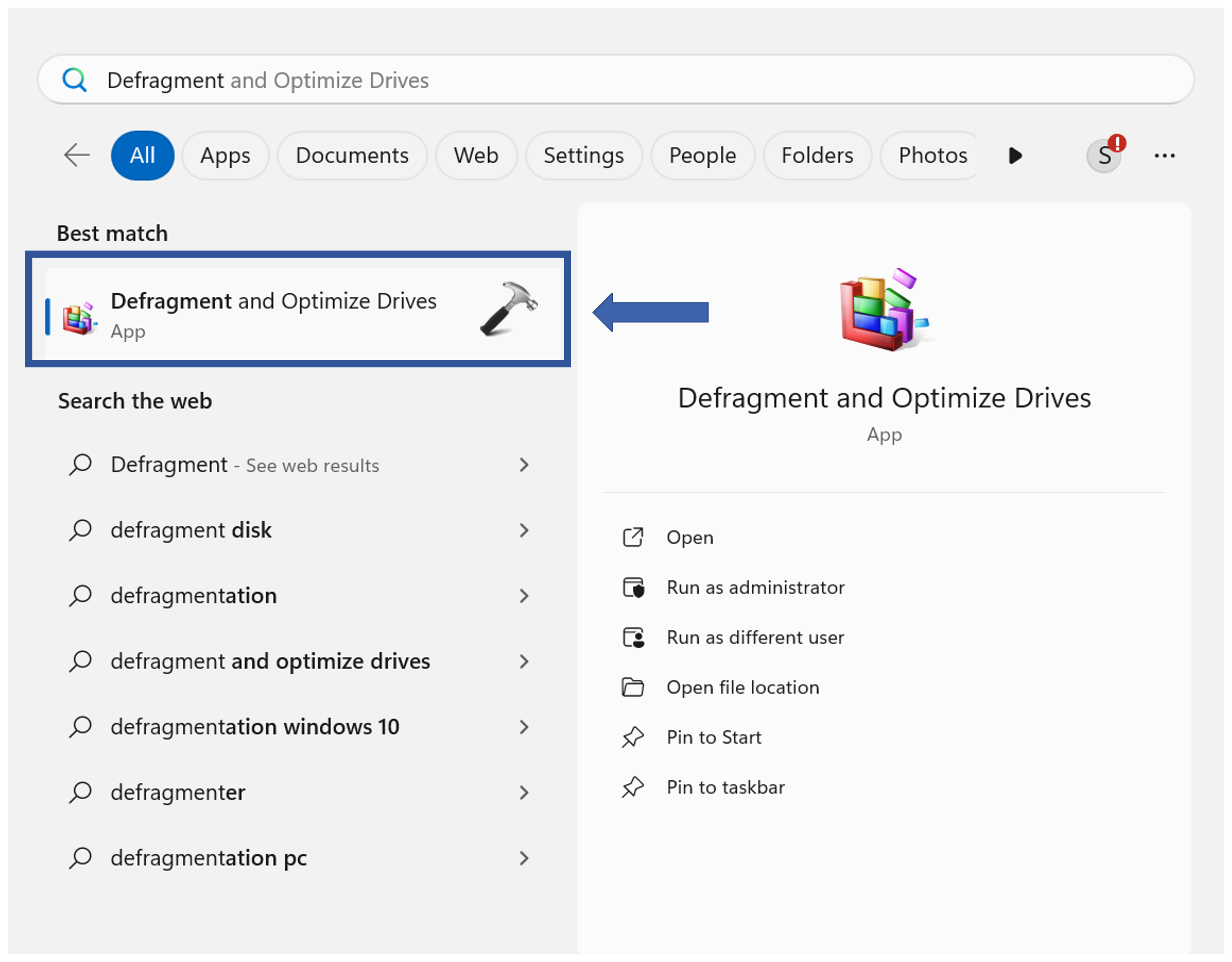 1. Öffnen Sie die Suchleiste und geben Sie „Defragmentieren“ ein. Öffnen Sie das „Laufwerke defragmentieren und optimieren”App.