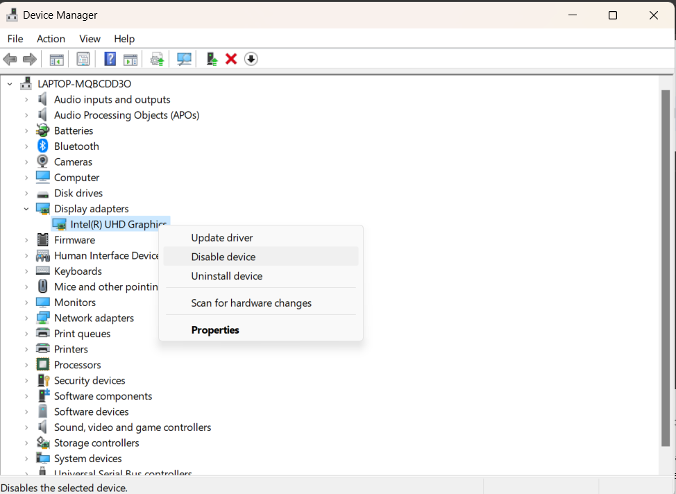 Schritt 3: Klicken Sie mit der rechten Maustaste auf Ihren Grafiktreiber und wählen Sie Gerät deaktivieren. Dadurch wird der aktuelle Treiber deaktiviert. Klicken Sie erneut mit der rechten Maustaste auf Ihren Grafiktreiber und wählen Sie Gerät aktivieren, um es erneut zu aktivieren.