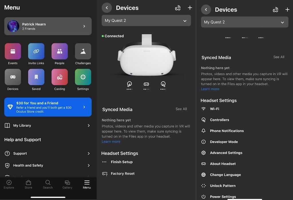 EinApp und eineApple iPhoneApp sind für die Quest verfügbar. Trotz der Namensänderung in Meta heißt die Telefon-App weiterhin Oculus. Wenn Ihr Oculus als registriertes Gerät angezeigt wird, können Sie über die mobile App problemlos einen Werksreset durchführen. Beachten Sie jedoch, dass dies möglicherweise nicht funktioniert, wenn Ihr Headset fehlerhaft ist.