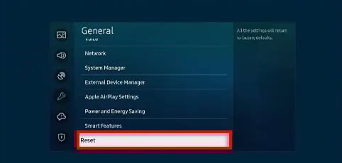 Wenn das Problem durch einen Neustart Ihres Fernsehers nicht behoben wird, können Sie versuchen, einen Hard-Reset durchzuführen. Dadurch werden alle Ihre Smart-TV-Daten gelöscht, alles, was Sie im Smart Hub installiert haben, und die Software und Firmware des Fernsehers werden auf die Werkseinstellungen zurückgesetzt. So führen Sie einen Werksreset durch: