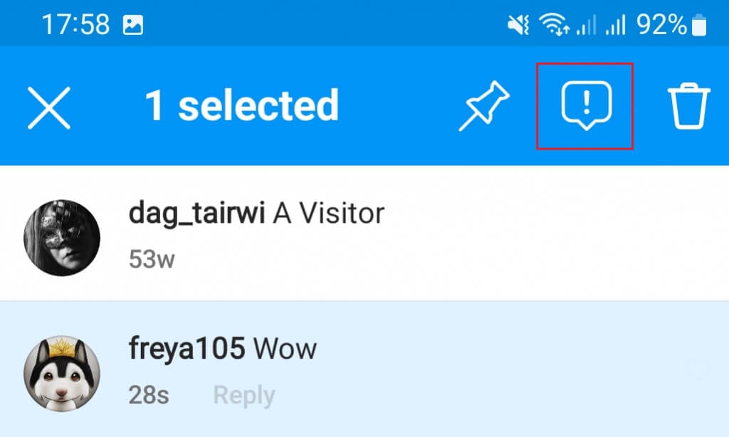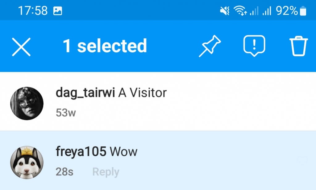 1. Wählen Sie den Kommentar zu Ihrem Beitrag aus, den eine Person hinterlassen hat, die Sie einschränken möchten. Halten Sie die Taste in der Android-App gedrückt, um auszuwählen. Wischen Sie auf dem Apple-Gerät nach links.