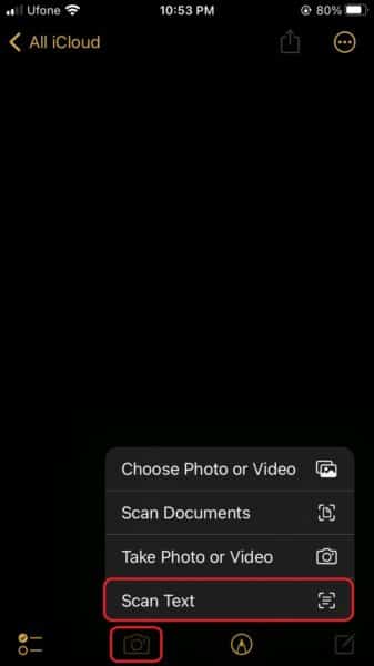 Öffnen Sie eine Notiz und drücken Sie dieKameraSymbol und wählen Sie dann ausText scannen.