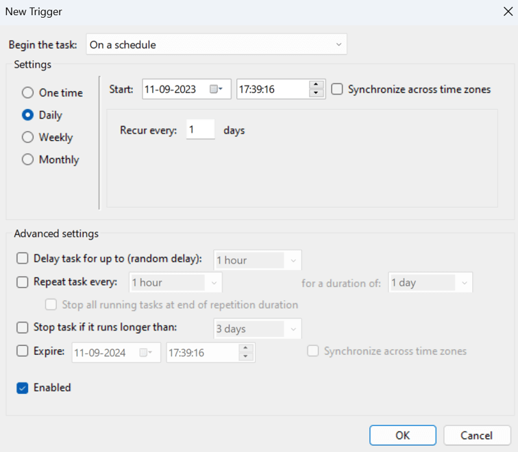 Schritt 7:Hier müssen Sie auf das erste Dropdown-Menü mit der Bezeichnung „Aufgabe beginnen“ klicken und „Nach einem Zeitplan“ auswählen. Klicken Sie außerdem unter „Einstellungen“ auf „Täglich“ und wählen Sie dann die Start- und Endzeit für Ihren Dunkelmodus aus. Vergessen Sie nicht, neben der Option „Wiederholen alle“ den Wert 1 festzulegen und abschließend auf die Schaltfläche „OK“ zu klicken.