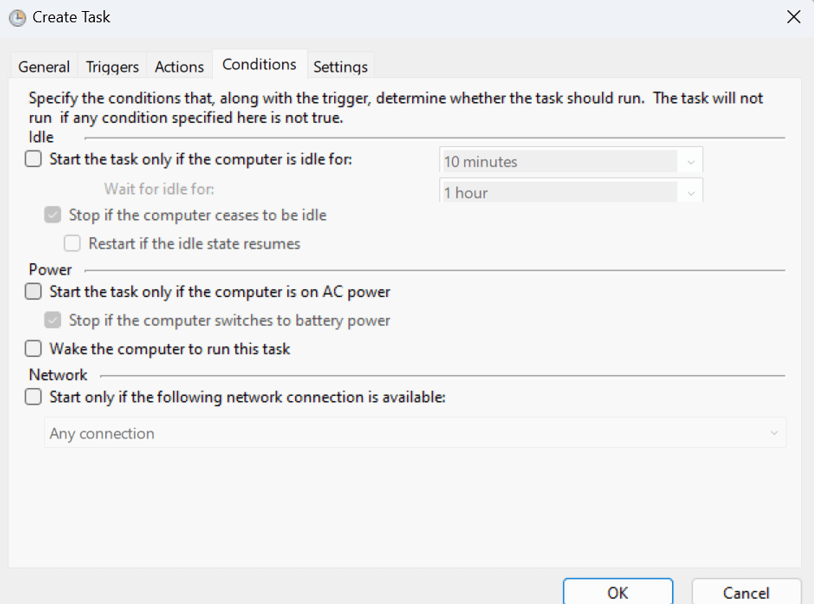 Schritt 10:Wählen Sie die Registerkarte „Bedingungen“ und entfernen Sie das Häkchen neben „Aufgabe nur starten, wenn der Computer an das Stromnetz angeschlossen ist“ und klicken Sie auf die Schaltfläche „OK“.