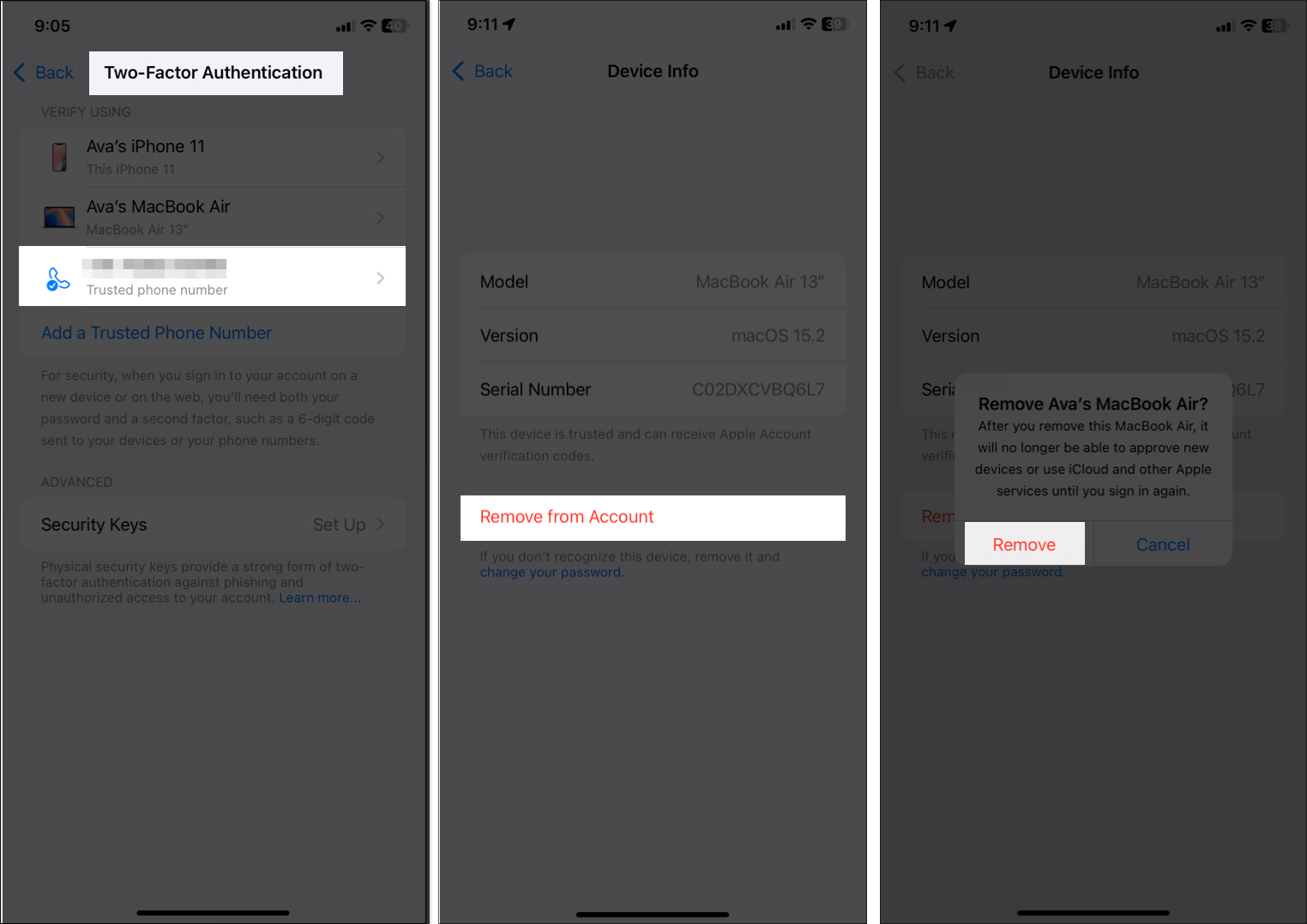 Wenn Sie auf diesem Gerät keine Bestätigungsaufforderungen erhalten möchten, tippen Sie auf „Aus Konto entfernen“. Ändern Sie dann Ihr Apple-ID-Passwort. Dadurch wird es von iCloud und anderen Apple-Diensten abgemeldet und unbefugter Zugriff verhindert.