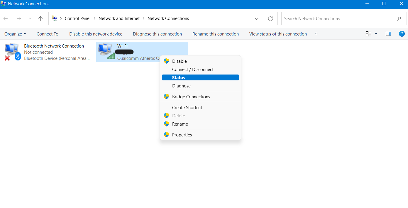 3.Sobald Sie dort sind, klicken Sie mit der rechten Maustaste aufW-lanund klicken Sie dann aufStatus.