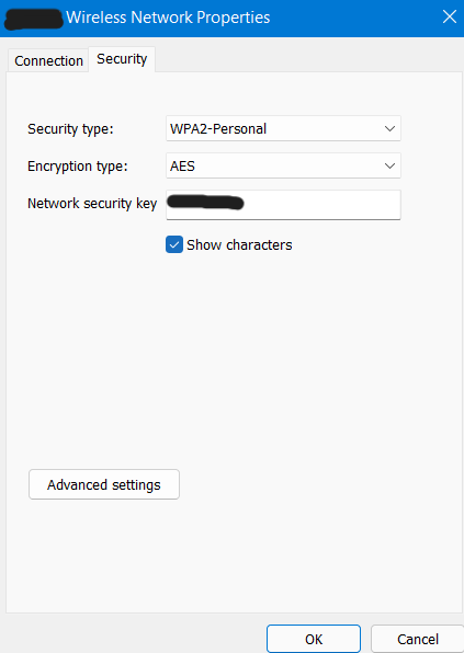 5.Gehen Sie nun zu SSicherheitund überprüfen Sie das Feld vonNetzwerksicherheitsschlüssel. Dies ist das gespeicherte WLAN-Passwort für das verbundene WLAN-Netzwerk. Um das Passwort anzuzeigen, aktivieren Sie das Kontrollkästchen danebenCharaktere anzeigen.