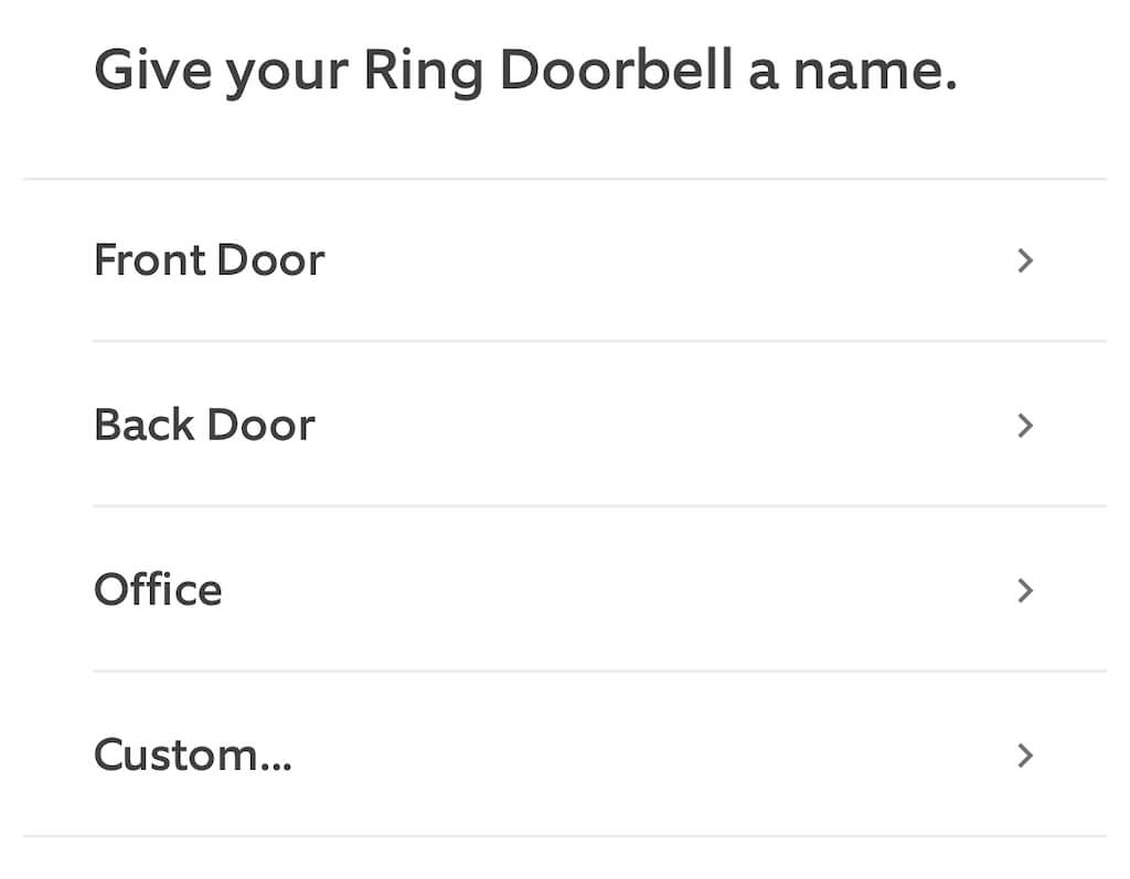 - Wählen Sie einen Namen für Ihre Ring Doorbell. Es gibt drei Standardnamen (Front Door, Back Door und Office) und die Option, einen benutzerdefinierten Namen zu erstellen.