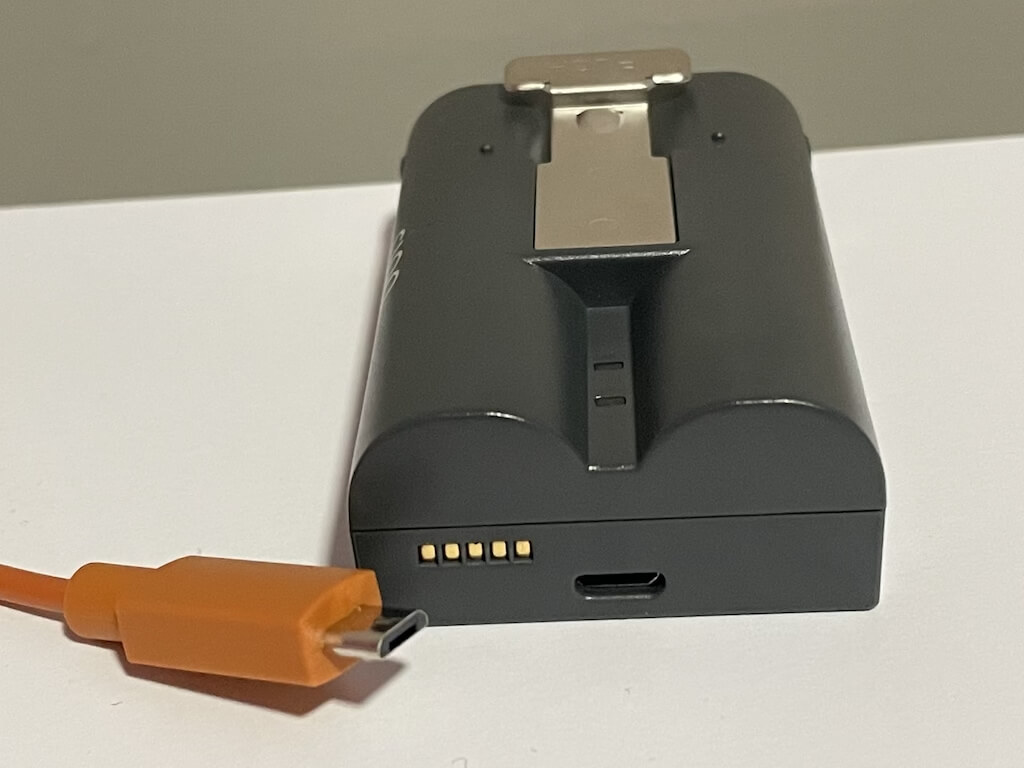 - Verwenden Sie das mitgelieferte orangefarbene Ladekabel, um es an der Rückseite des Akkus anzuschließen. Das vollständige Aufladen dauert zwischen fünf und zehn Stunden.