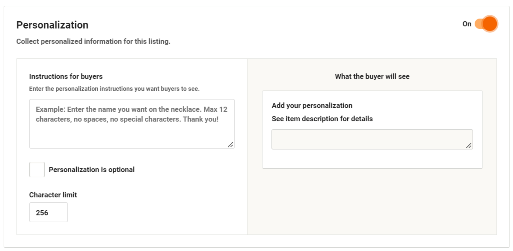 - Wenn Ihr Artikel personalisiert werden kann, aktivieren Sie diese OptionPersonalisierungund geben Sie die Personalisierungsanweisungen für Kunden ein.