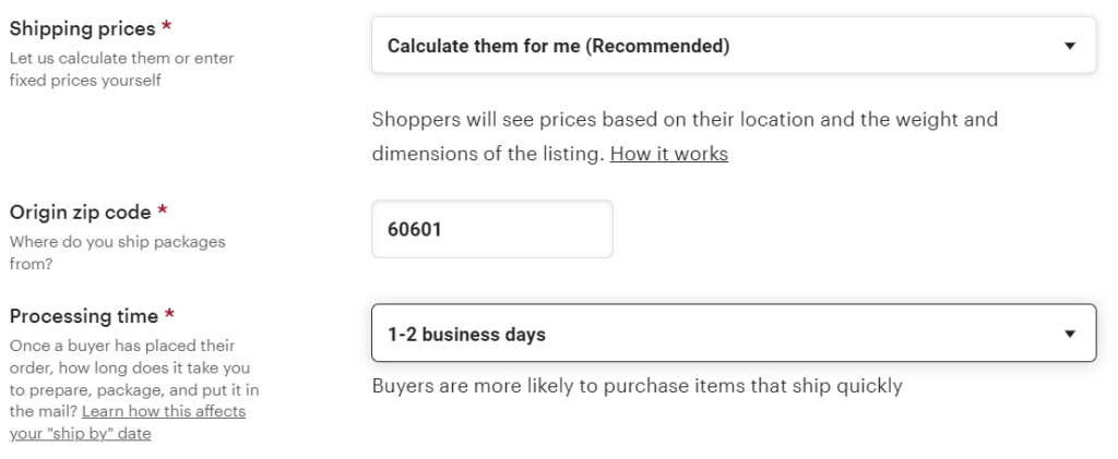- Geben Sie als Nächstes die einVersandOptionen für Ihr Produkt. Sie können den Versandpreis für Ihren Artikel von Etsy berechnen lassen oder die Versandkosten manuell festlegen. Geben Sie die Postleitzahl ein, von der aus Sie die Pakete versenden und wie lange es dauert, bis ein Produkt versendet wird, nachdem ein Kunde eine Bestellung aufgegeben hat.
