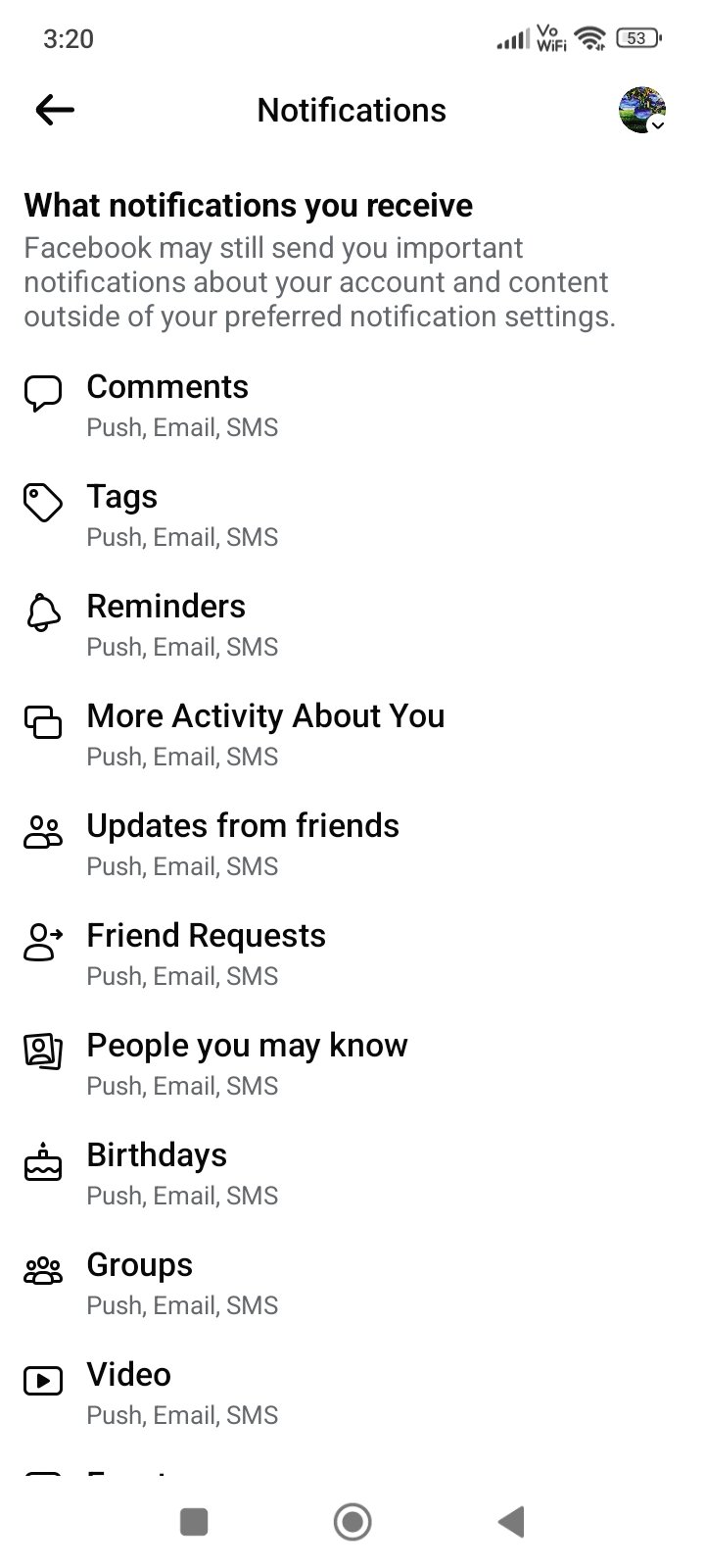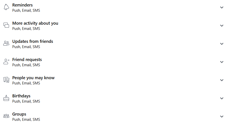 - Daraufhin werden die drei Kategorien von Benachrichtigungen angezeigt, die Sie blockieren können: Push, E-Mail und SMS. Oder Sie können die Benachrichtigungen einfach vollständig deaktivieren, indem Sie den obersten Schalter verwenden.