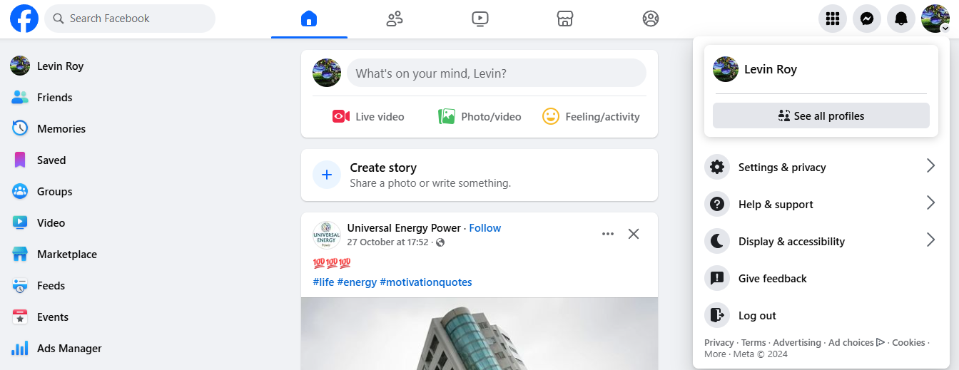 - Öffnen Sie Facebook und klicken Sie oben rechts auf das Kontosymbol, um das Dropdown-Menü aufzurufen. Die erste Option,Einstellungen und Datenschutz, ist das, was Sie brauchen.