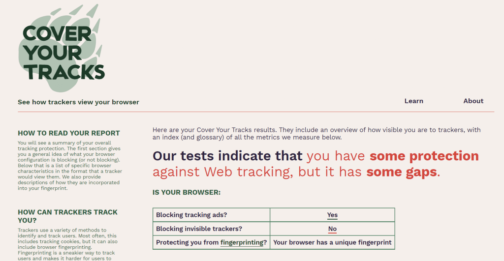 Das Tool der Electronic Frontier Foundation (EFF) konzentriert sich auf genau diesen Aspekt der Sicherheit. Der zuvor Panopticlick genannte Sicherheitstest wurde in CoverYourTracks umbenannt, um seinen Zweck besser widerzuspiegeln.