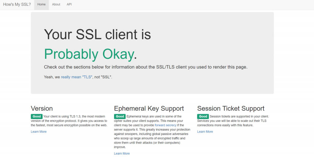 Hier kommt dieser Test ins Spiel. Sie können einfach diese Website besuchen, um zu testen, wie Ihr Browser in Bezug auf die SSL-Unterstützung dasteht. Der Bericht listet Ihre SSL-Version sowie die Kompatibilität des Browsers mit zusätzlichen TLS-Funktionen auf.