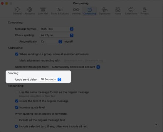 Um die Verzögerung "rückgängig zu senden" auf Ihrem Mac einschalten:Gehen Sie zur E -Mail -App → Menüleiste → E -Mail → Einstellungen → Komponieren → Verspätung senden → Wählen Sie 10, 20 oder 30 Sekunden.