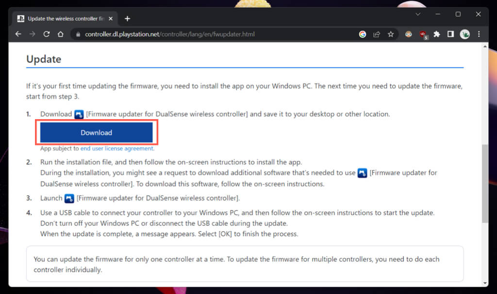 - Herunterladen "Firmware-Updater für den DualSense-Wireless-Controller” von der offiziellen PlayStation-Website.