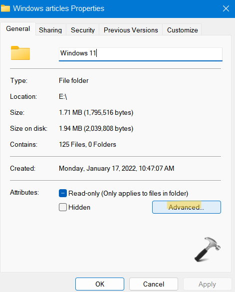 2.Gehen Sie jetzt zumAllgemeinRegisterkarte und klicken Sie dann aufFortschrittlichRegisterkarte unten vorhanden.
