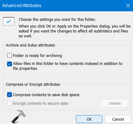 3.Aktivieren Sie als Nächstes das Kontrollkästchen danebenKomprimieren Sie Inhalte, um Speicherplatz zu sparen. Drücken Sie dannOK.