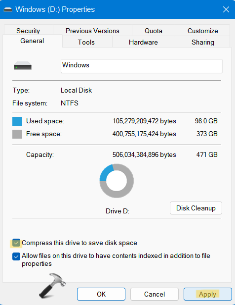 2.Gehen Sie jetzt zumAllgemeinKlicken Sie auf die Registerkarte und aktivieren Sie dann das Kontrollkästchen nebenKomprimieren Sie dieses Laufwerk, um Speicherplatz zu sparen. Klicken Sie aufAnwenden.