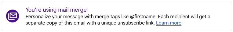 Mit der Serienbrieffunktion in Gmail, die einst als „Mehrfachversand“-Funktion bezeichnet wurde, können Sie Google-Kontakte oder eine Mailingliste aus Google Sheets einfügen. Personalisieren Sie dann Ihre E-Mail-Nachricht mit Zusammenführungs-Tags, fügen Sie eindeutige Abmeldelinks hinzu und genießen Sie einen einfachen Massen-E-Mail-Prozess mit Ihrer bevorzugten E-Mail-Anwendung.