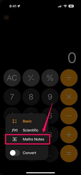 4.Tippen Sie im folgenden Überlaufmenü aufOption „Mathenotizen“..