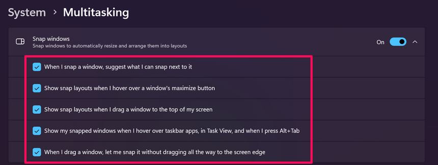 Wenn Sie also die SNAP -Funktion auf Ihrem Windows 11 -PC oder Laptop nicht mögen, befolgen Sie die Schritte unten, um andere SNAP -Einstellungen zu deaktivieren und/oder verwalten: