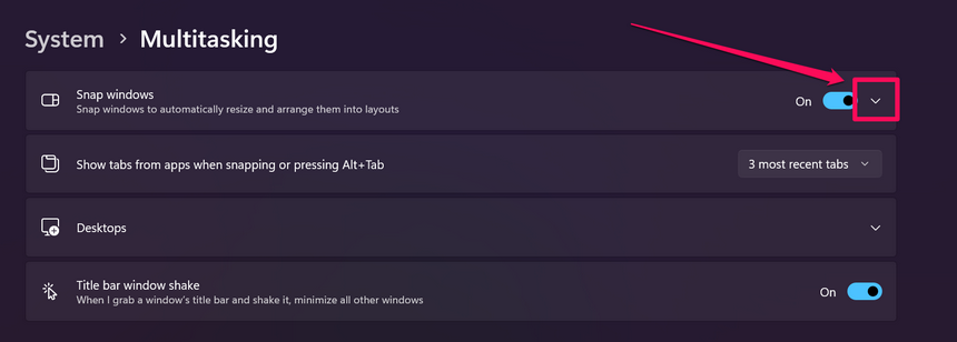 4.Wenn Sie jedoch wollenPassen Sie andere SNAP -Einstellungen anUm die Funktion gemäß Ihren Präferenzen anzupassen,Klicken Sie auf den Down -Pfeilneben demWindows -Option schnappenUm es zu erweitern.