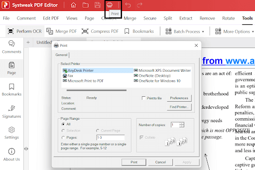 2.DruckenIhr PDF –Wenn Sie mit der Bearbeitung und Feinabstimmung Ihrer PDF-Dateien fertig sind, klicken Sie einfach im oberen Menü auf das Symbol „Drucken“ und wählen Sie Ihre Einstellungen aus, um die physische Kopie der PDF-Datei zu erhalten.