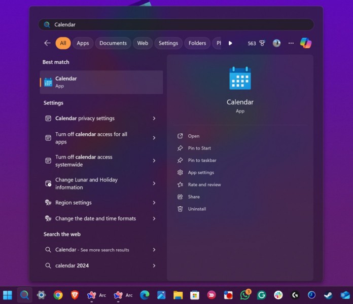Sobald Sie die Kalender-App auf Ihrem Windows 11-PC oder Laptop installiert haben, sollten Sie sie mit einer einfachen Fenstersuche auf Ihrem Gerät finden können.