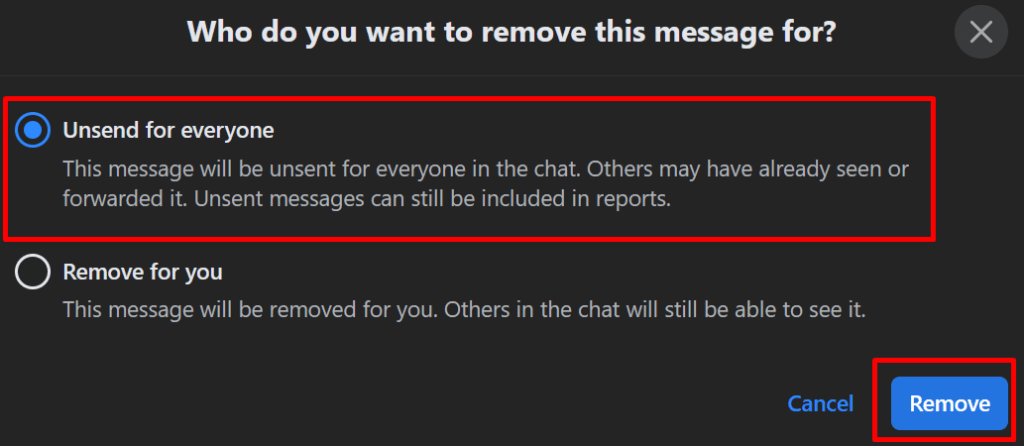 - WählenFür alle sendenOption, wenn Sie dazu aufgefordert werden, und klicken oder tippen Sie aufEntfernenTaste.