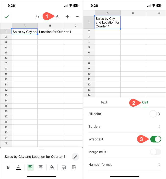 In der mobilen Google Sheets-App haben Sie eine Option zum Umbrechen von Text, die mit der oben beschriebenen Funktion „Umbrechen“ identisch ist. Die Größe der Zelle mit den Daten wird automatisch angepasst, um den Text aufzunehmen, der in die nächste Zeile umgebrochen wird.