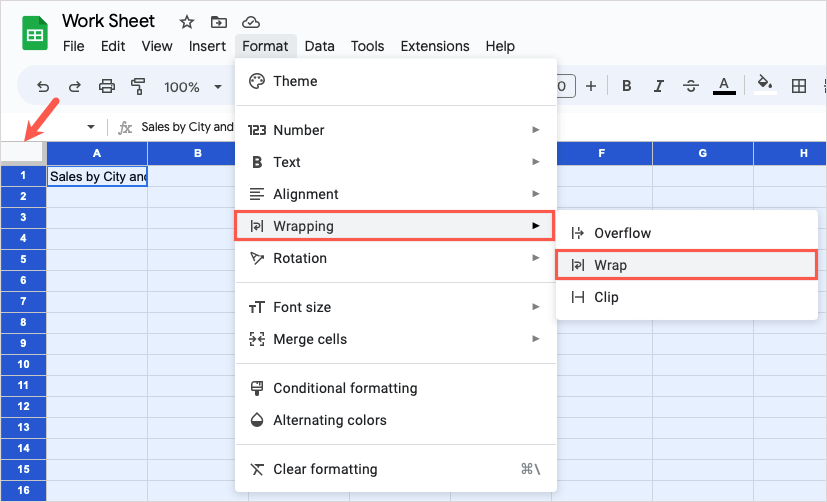 Um alle Zellen so einzustellen, dass der von Ihnen eingegebene Text umbrochen wird, verwenden Sie dieWählen Sie „Alle“ ausKlicken Sie auf die Schaltfläche (Quadrat zwischen Spalte A und Zeile 1), um das gesamte Blatt auszuwählen.