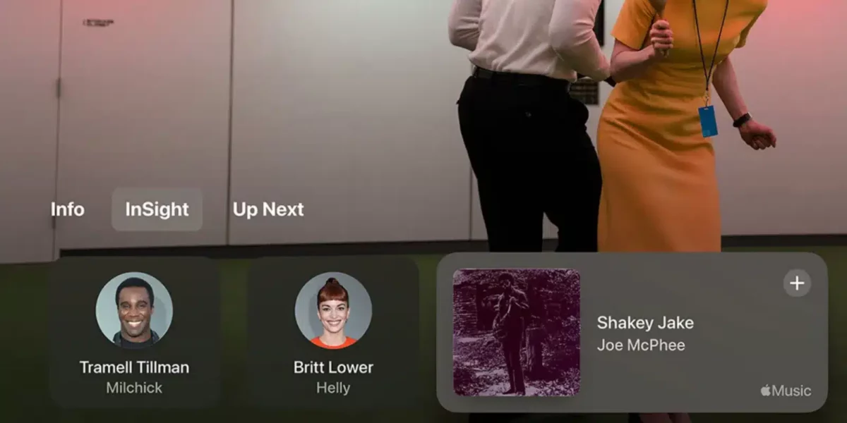 Apple TV InSight ist eine dynamische, informative Ergänzung zur TV-App-Oberfläche. Es befindet sich am unteren Bildschirmrand und bietet Echtzeit-Updates über die in der aktuellen Szene auftretenden Schauspieler und die im Hintergrund abgespielte Musik.