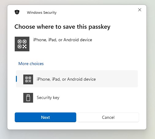 4. Als nächstes müssen Sie auswählen, wo der Passkey gespeichert werden soll. Es gibt drei Methoden zum Speichern des Passkeys. Sie können Ihre biometrischen Daten verwenden, wofür ein Telefon oder die Einrichtung einer PIN erforderlich ist, oder Sie wählen die Sicherheitsschlüsseloption, wenn Sie beispielsweise einen YubiKey verwenden.