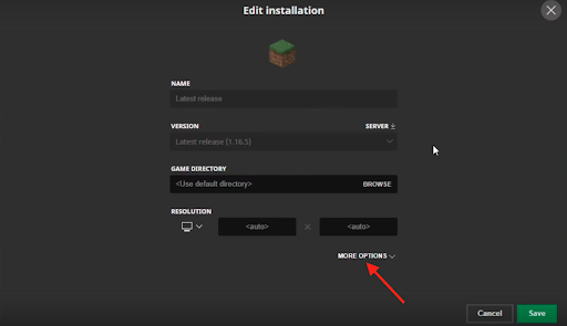 - Drücken Sie auf das Dropdown-Menü Menü danebenMinecraft Java-Versionund auswählen64-Bit.