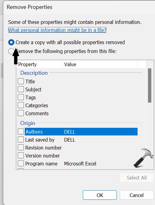 5. Klicken Sie aufErstellen Sie eine Kopie, bei der alle möglichen Eigenschaften entfernt werden. Dadurch wird eine neue Kopie Ihrer Zieldatei ohne die Eigenschaften erstellt. Oder Sie klicken aufEntfernen Sie die folgenden Eigenschaften aus den DateienDies hilft Ihnen bei der Auswahl der Eigenschaften, die Sie mit anderen teilen möchten.