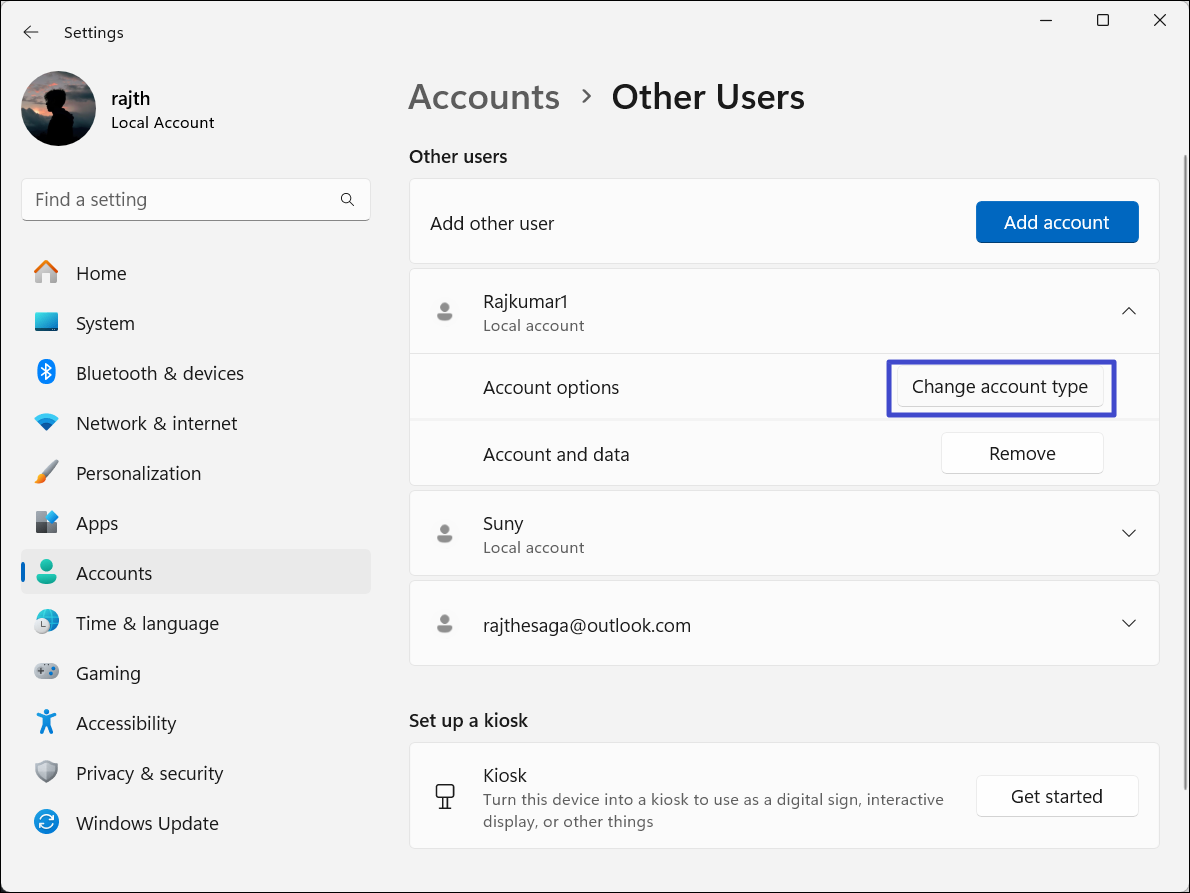 Wenn Sie kein anderes Administratorkonto haben, können Sie ein lokales Konto in ein Administratorkonto ändern oderAktivieren Sie den integrierten Administrator in Windows 11. Alternativ können Sie ein neues lokales Konto speziell zum Umbenennen des Ordners erstellen, es in „Administrator“ ändern und anschließend wieder zu Ihrem Hauptkonto wechseln.