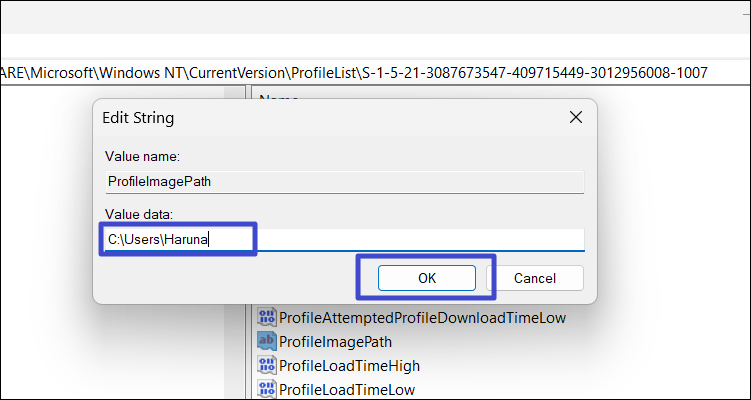 4. Wählen Sie die SID für das Benutzerkonto aus, das Sie umbenennen möchten, und doppelklicken Sie auf „ProfileImagePath“Wert.