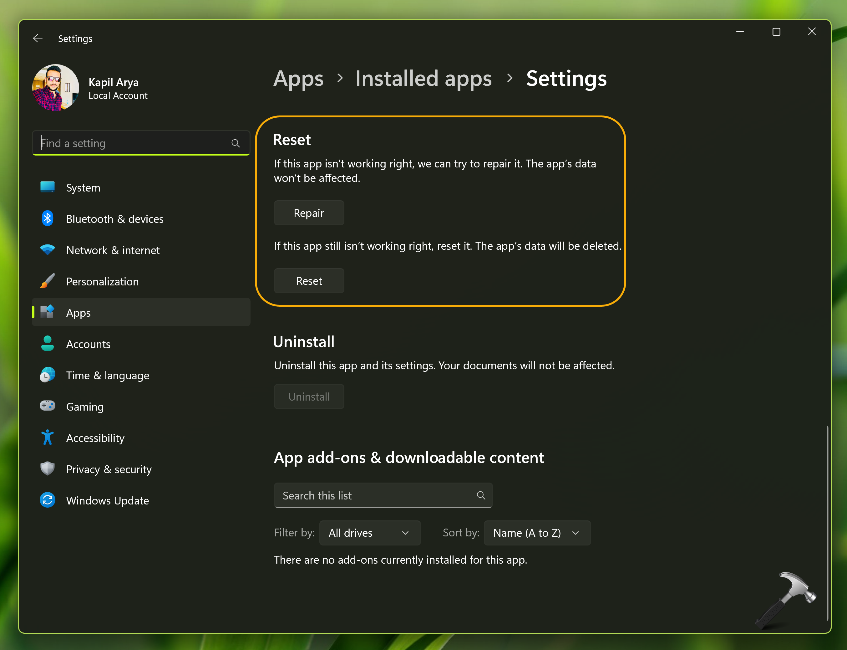 - Dadurch werden Einstellungen > Apps > Installierte App > Einstellungen geöffnet. Sie können zunächst versuchen, die App zu reparieren, indem Sie hier auf die Option „Reparieren“ klicken. Wenn das nicht funktioniert, können Sie auf die Option „Zurücksetzen“ klicken, um die Einstellungen auf die Standardeinstellungen zurückzusetzen. Durch das Zurücksetzen werden die Daten der Einstellungen-App gelöscht.