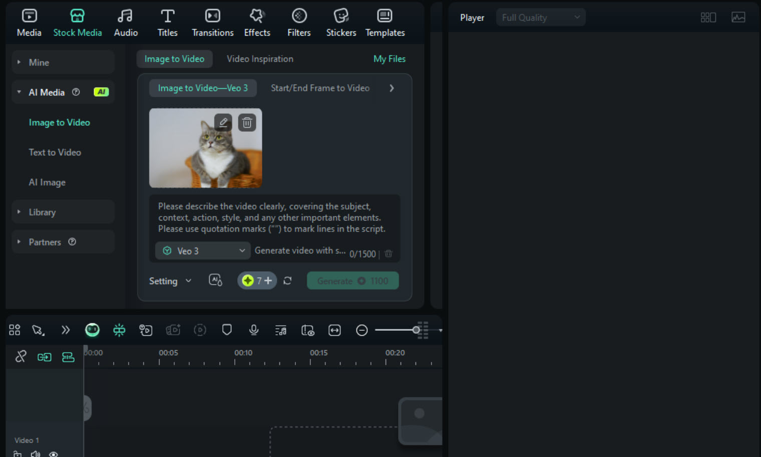 Sobald Ihre Fotos hochgeladen sind, beschreiben Sie Ihre Szene oder Idee im Eingabefeld. Wählen Sie dann VEO 3, das leistungsstarke Bewegungserzeugungsmodell von Filmora, um automatisch lebensechte Übergänge, Tiefe und sanfte Bewegungen hinzuzufügen. Klicken Sie auf „Video generieren“, um eine Vorschau des Ergebnisses anzuzeigen.