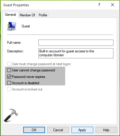 4.Überprüfen Sie abschließend im GästeeigenschaftsblattDas Passwort läuft nie abund deaktivieren Sie die anderen dort vorhandenen Optionen. KlickenAnwendengefolgt vonOK.