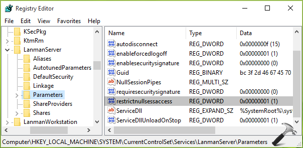 5.Zuletzt im rechten Bereich vonParameterSchlüssel, legen Sie das Registrierungs-DWORD (REG_DWORD) mit dem Namen festrestringnullsessaccessvon 1 bis0. Schließen Sie den Registrierungseditor und starten Sie ihn neu.