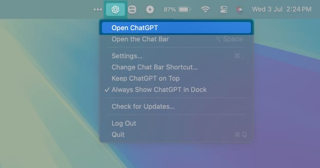 1.Dock und Menüleiste: Sie können die ChatGPT-App für einen einfachen Zugriff an Ihr Dock anheften. Alternativ gibt es auch ein ChatGPT-Symbol in der oberen Menüleiste, auf das Sie klicken können, um schnell ChatGPT anzurufen.
