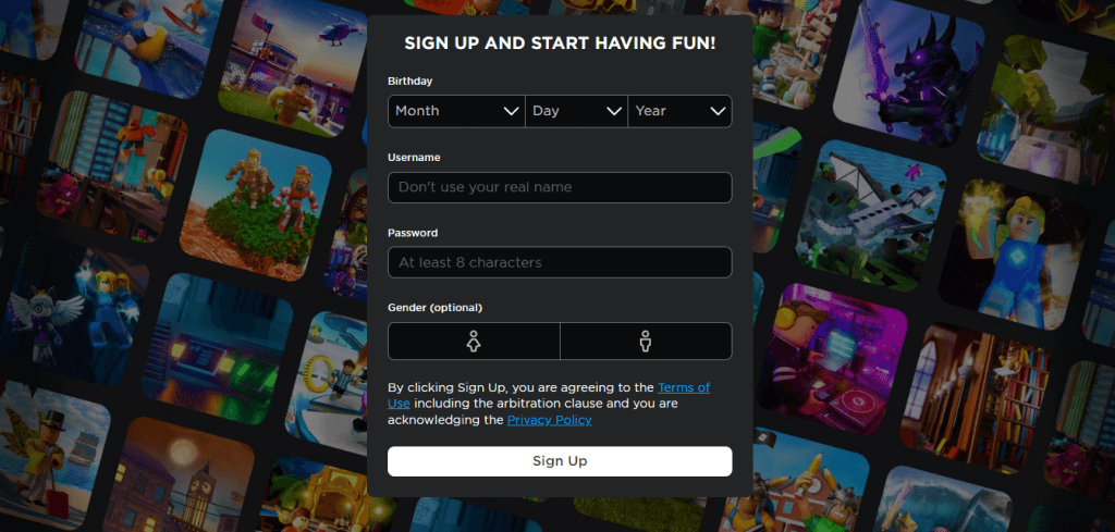 - Wenn Sie dies zum ersten Mal tun, verwenden Sie dieMelden Sie sich anOption zum Erstellen eines Kontos zuerst. Alles, was Sie brauchen, um ein Roblox -Konto zu erstellen, ist ein Benutzername und ein Passwort, obwohl es möglicherweise einige Versuche erfordern, einen Benutzernamen zu finden, der noch nicht aufgenommen wird.