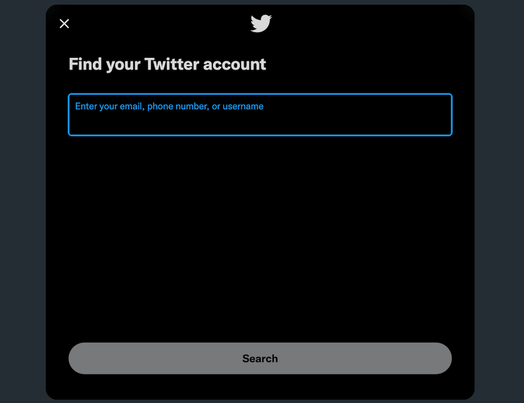 - Geben Sie im angezeigten Menü Ihren Twitter-Benutzernamen, Ihre Telefonnummer oder Ihre E-Mail-Adresse ein und wählen Sie dann ausSuchen.
