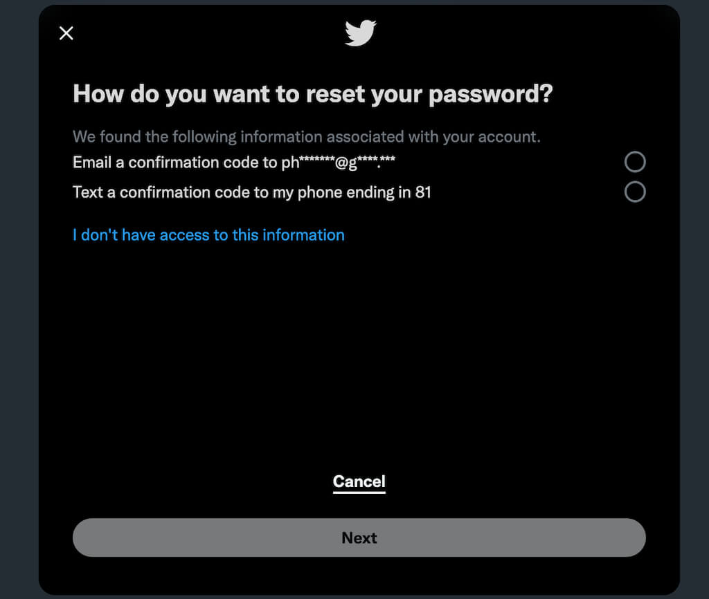 - Wenn Sie über ein mit Twitter verknüpftes Konto verfügen, können Sie wählen, ob Sie einen Bestätigungscode per E-Mail oder SMS erhalten möchten. Wählen Sie eine dieser Optionen aus und tippen Sie aufNächste.